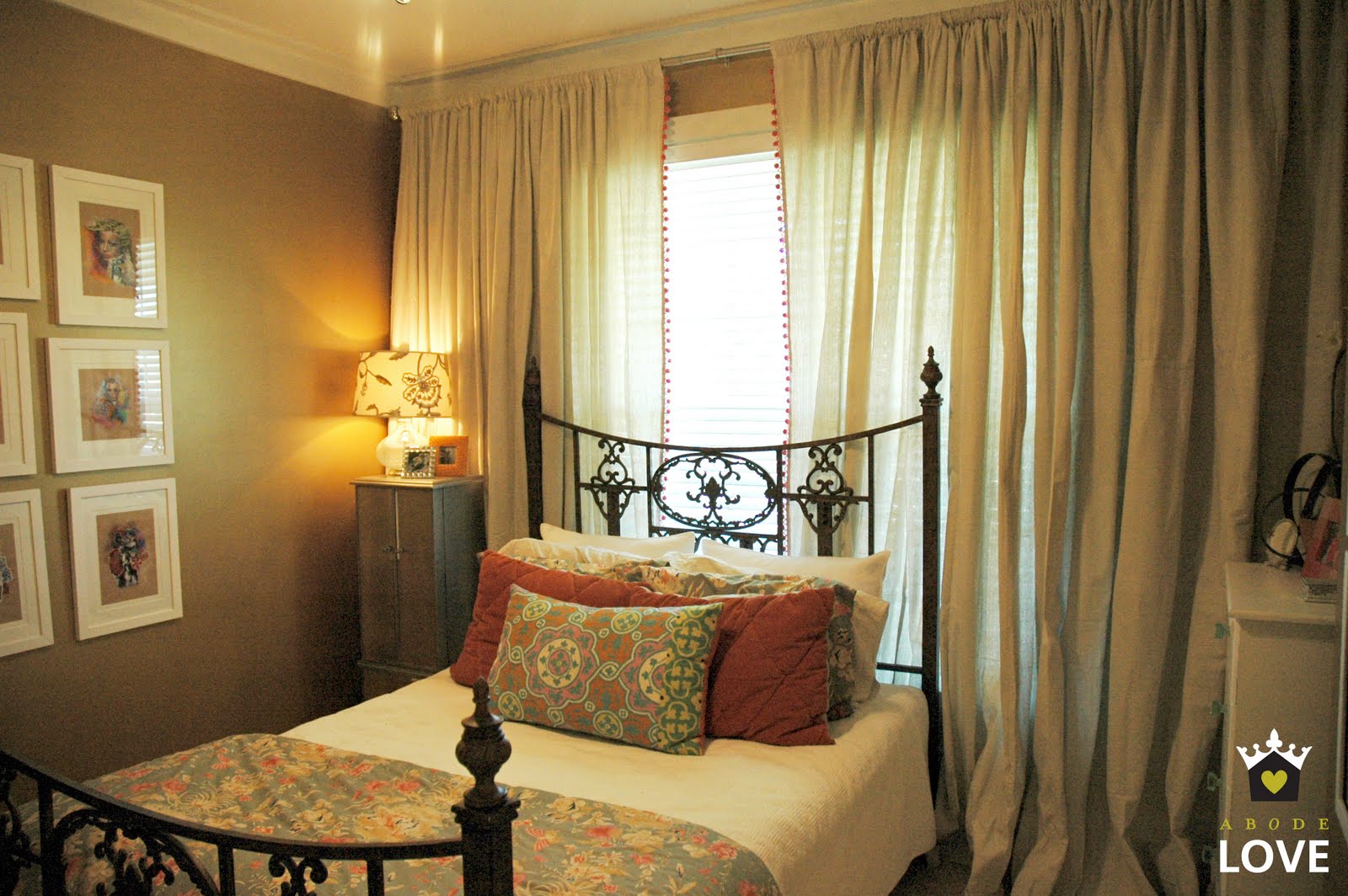 So, sorry in advance for the quality of these photos- but here is my abode's guest bedroom! This whole room was inspired by all of the artwork that I have hanging on the walls. This is artwork that I created while attending Auburn University and I really wanted to put them on display in our abode. I created the drop cloth curtains for this space to add a bit of drama to the space and loved the way they turned out. The walls are deep metallic gold (from Ralph Lauren's paint collection) and I think they add a warmth that's perfect for guests to feel at home!